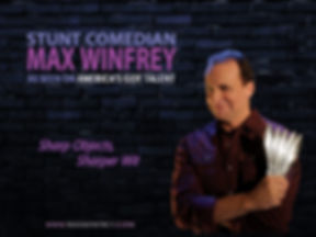 Stunt Comedian Max Winfrey combines his love of improvisation and physical comedy to bring a fast paced- no holds barred show that has left a trail of laughs and gasps across the globe.  He has made numerous appearances on national television including NBC's America's Got Talent.  He is a frequent headliner for Holland America Cruise Line and was a recent addition to The Guinness Book of World Records for axe juggling.